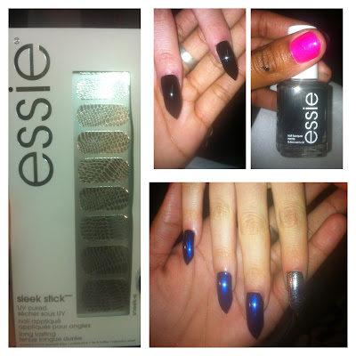 For dramatic midnight blue nails, Joy used Black Licorice by Essie as a base and then topped with Brilliant blue Scandalous Shenanigans by China Glaze. She easily created an accent nail with Essie Sleek Stick textured silver nail wraps.