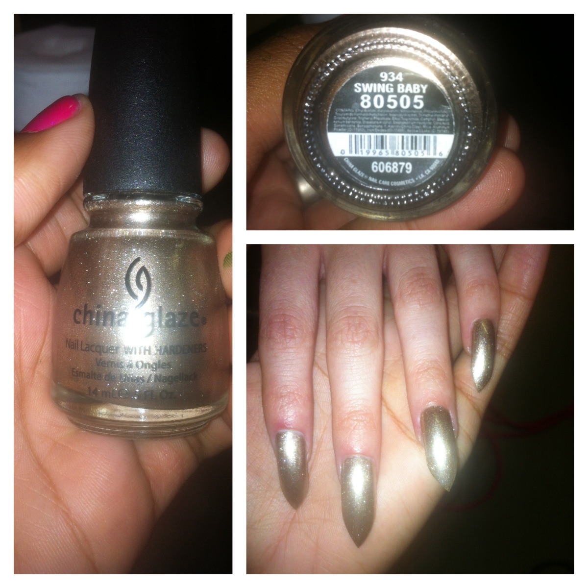 To create a gorgeous frosted gold shade, Joy applied two coats of Swing Baby by ChinaGlaze.
